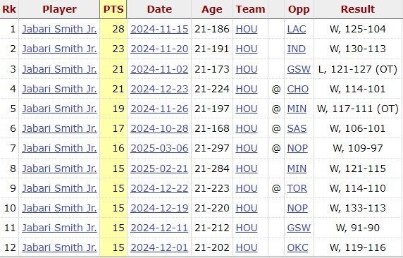 據(jù)統(tǒng)計(jì),賈巴里-史密斯本賽季得分15+的比賽火箭12勝1負(fù),只輸給勇士。