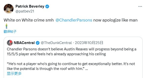 今天,貝弗利則打臉帕森斯,轉(zhuǎn)發(fā)了后者曾說(shuō)“里夫斯15+5+5就已經(jīng)到極限了”的言論,并寫(xiě)道:“白人看不起白人,無(wú)語(yǔ)了,像個(gè)男人一樣出來(lái)道歉!”