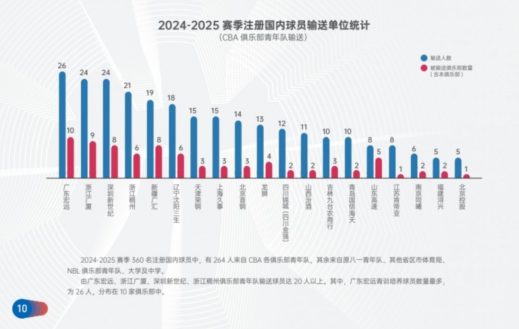 2024-2025賽季 360 名注冊國內(nèi)球員中,有264人來自CBA各俱樂部青年隊(duì),其余來自原八一青年隊(duì)、其他省區(qū)市體育局、NBL俱樂部青年隊(duì)、大學(xué)及中學(xué)。