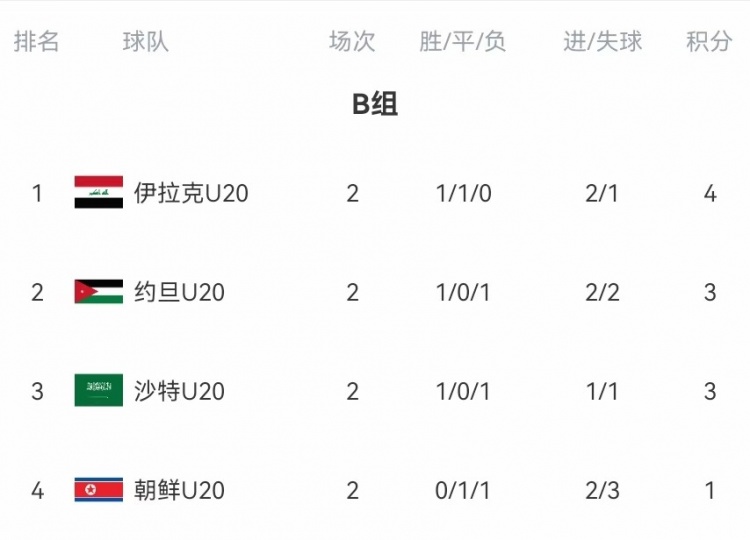 不過B組當(dāng)前形勢較為復(fù)雜,沙特U20將在末輪對陣朝鮮U20、伊拉克U20則將和約旦U20對話。4支球隊均存在晉級可能和出局可能。除了朝鮮U20之外,其他3隊都可能成為小組頭名。由于B組末輪比賽將在明日才會開戰(zhàn),也無從參考。
