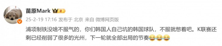 媒體人苗原發(fā)文表示:浦項(xiàng)鐵人沒啥不服氣的,你們韓國(guó)人自己坑的韓國(guó)球隊(duì),不服就憋著吧。K聯(lián)賽還剩已經(jīng)削弱了很多的光州,下一輪就全部出局的節(jié)奏。