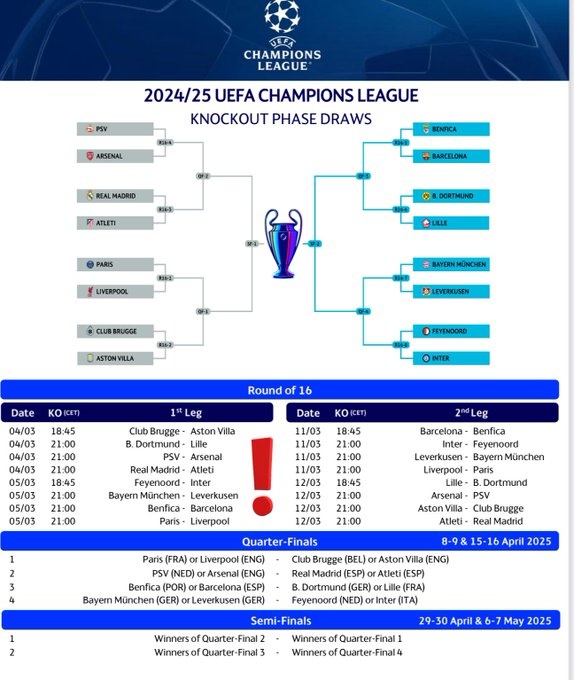 2月22日訊 24/25賽季歐冠淘汰賽賽程出爐,1/8決賽首回合將在3月5日凌晨開戰(zhàn)。
