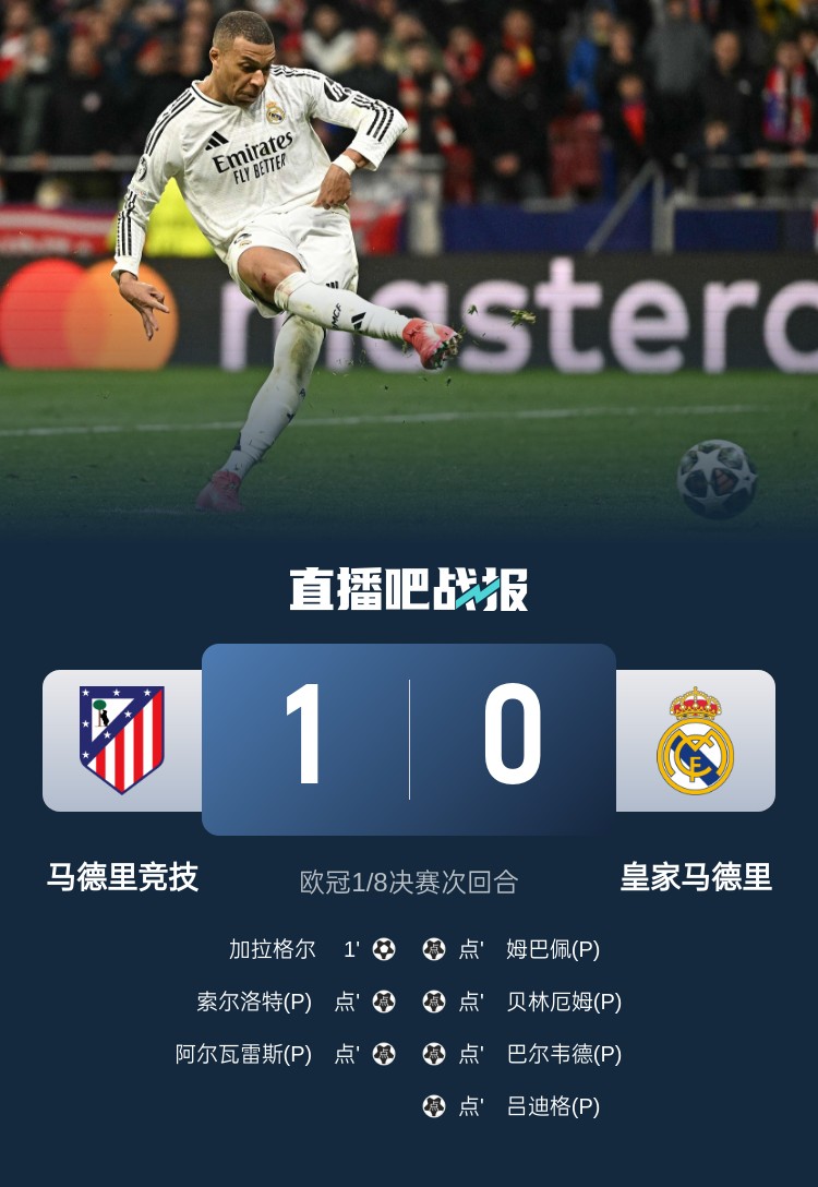 歐冠1/8決賽次回合,皇馬兩回合2-2,點球大戰(zhàn)4-2擊敗馬競晉級歐冠8強,將迎戰(zhàn)阿森納。上半場,加拉格爾閃擊破門,阿爾瓦雷斯兩次勁射被庫爾圖瓦撲出;下半場,姆巴佩造點,維尼修斯主罰打飛;加時賽,雙方均未制造破門良機;點球大戰(zhàn),阿爾瓦雷斯滑倒二次觸球進球無效,巴斯克斯主罰被撲,略倫特擊中橫梁。
