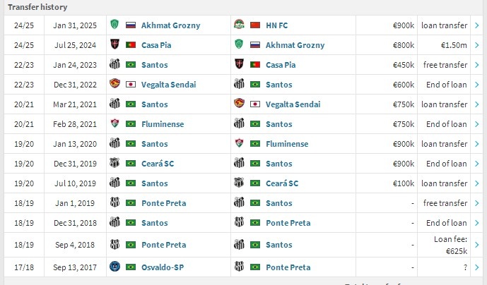 根據(jù)《轉(zhuǎn)會(huì)市場》資料,卡多索已經(jīng)由格羅茲尼租借加盟河南隊(duì),球員目前的身價(jià)是90萬歐元。