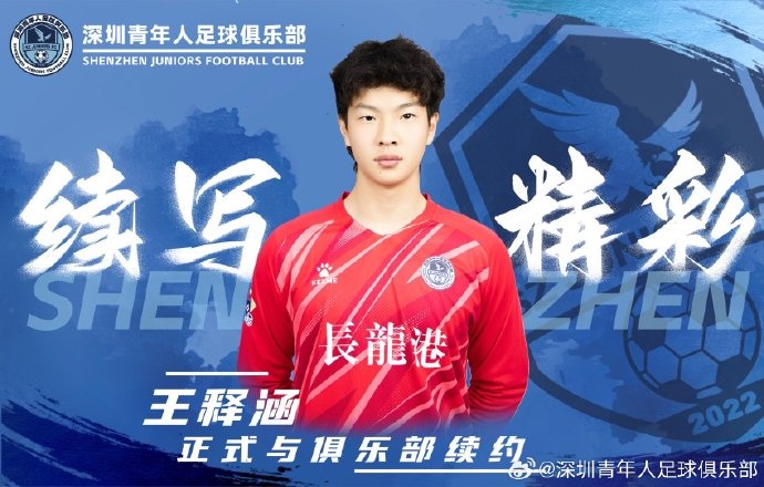 王釋涵今年20歲,司職門將,球員去年年初從上海申花轉(zhuǎn)會深圳青年人,此次順利續(xù)約。